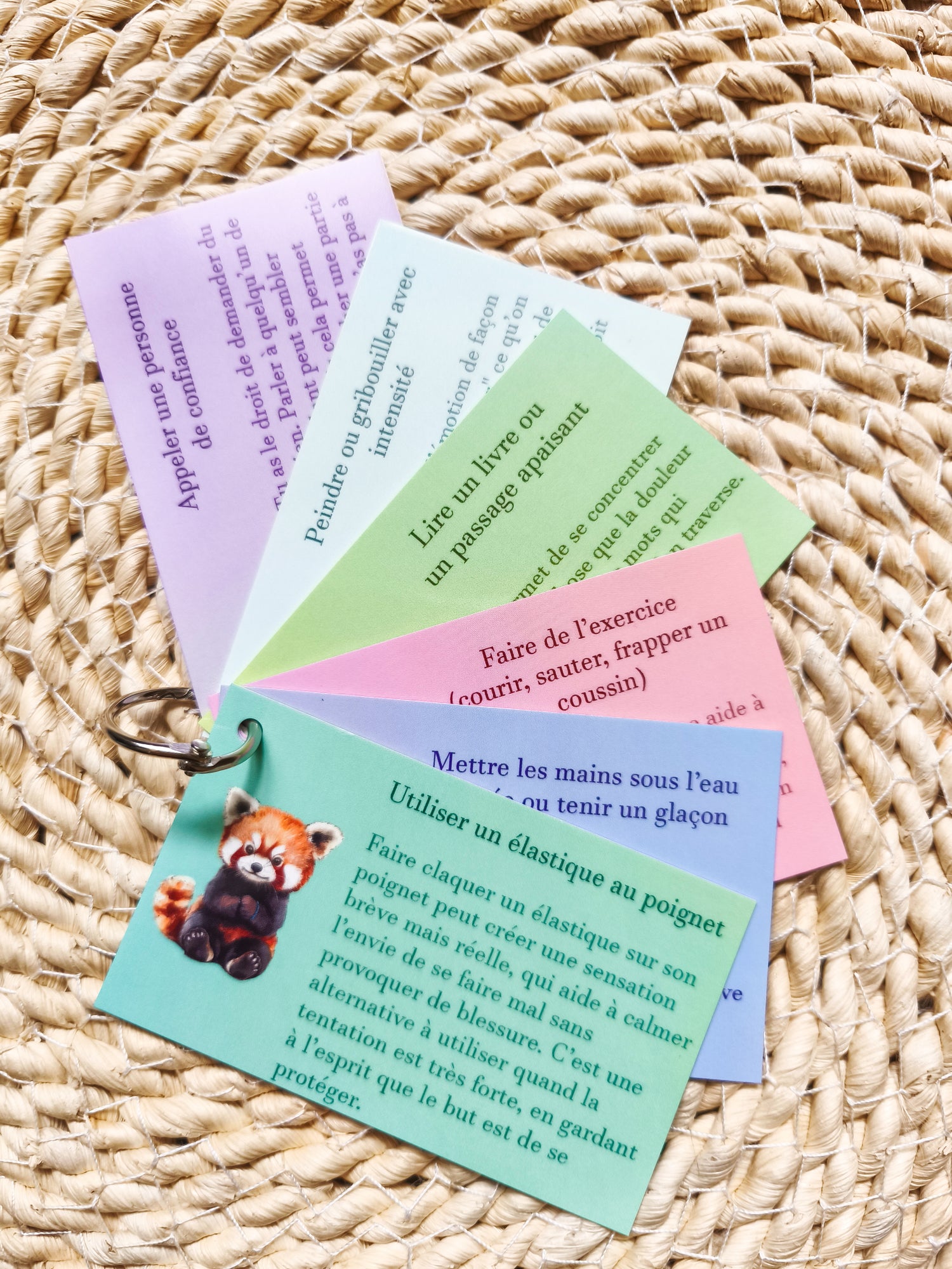 Ces cartes sont à utiliser dès que l’envie de se blesser commence à monter, que ce soit en pleine crise émotionnelle, lors d’un trop-plein intérieur, ou face à une impulsion difficile à contenir.